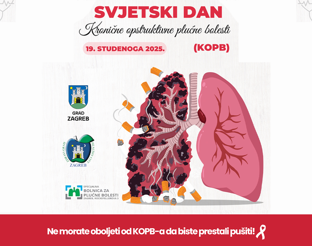 U sklopu obilježavanja Svjetskog dana KOPB-a, Specijalna bolnica za plućne bolesti i Gradski ured za socijalnu zaštitu, zdravstvo, branitelje i osobe s invaliditetom Grada Zagreba će na Tribini Grada Zagreba, Kaptol 27, 19.11.2025., u vremenu od 9.00 do 15.00 sati održati javnozdravstvenu akciju tijekom koje će svim zainteresiranima sugrađanima ponuditi izvođenje spirometrije i savjet s liječnikom specijalistom pulmologom.